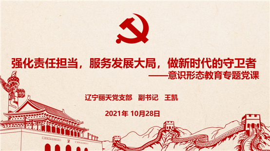 •     10月下旬,辽宁丽天召开2021年度意识形态工作研究专题会议,党支部副书记王凯同志讲授《强化责任担当,服务发展大局,做新时代的守卫者》意识形态教育专题党课,陆敏山书记对辽宁丽天2021年意识形态工作的推进和后续要...