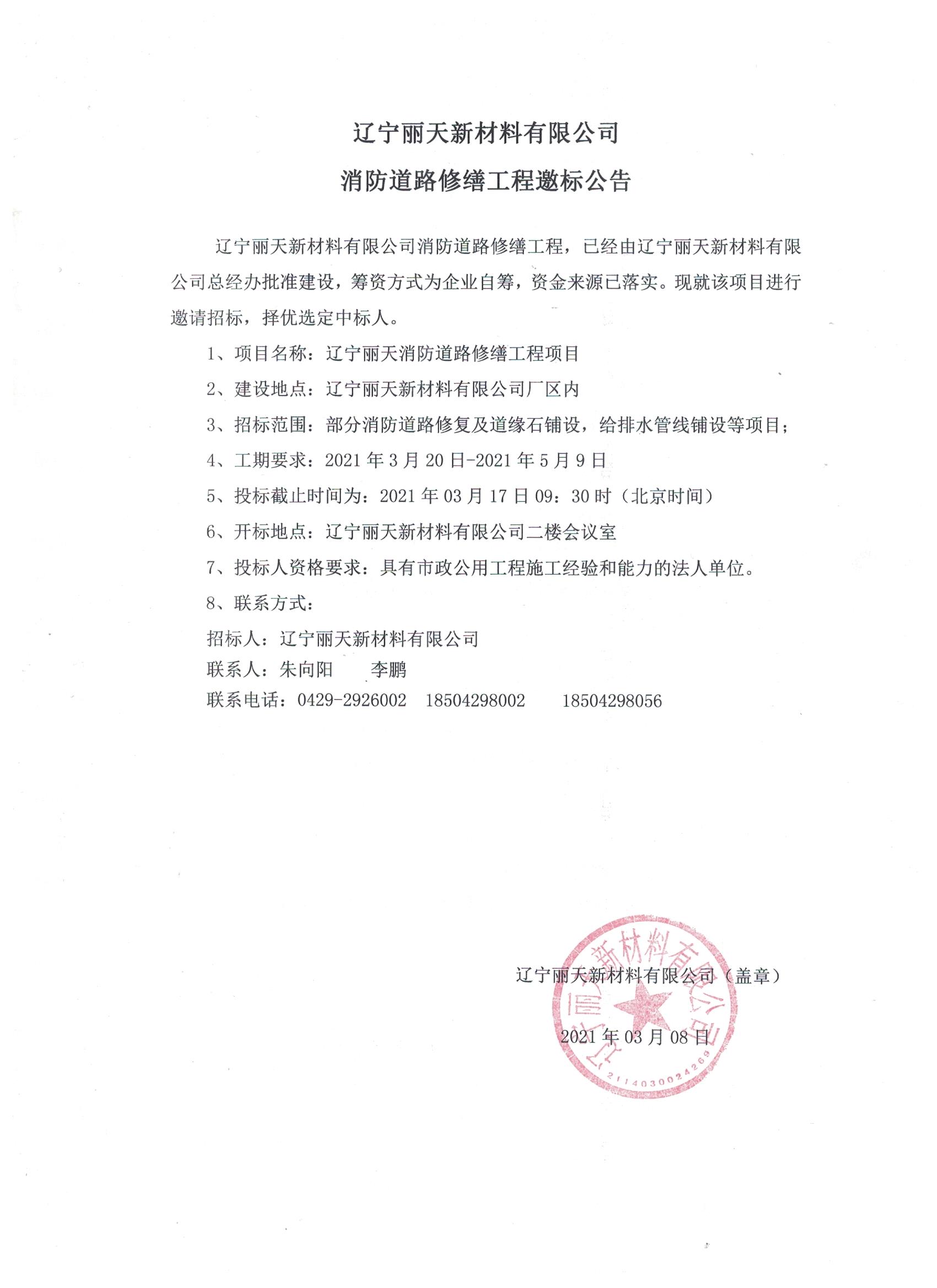 •               辽宁丽天新材料有限公司厂区绿化工程        辽宁丽天厂区绿化工程     邀 标 文 件                             招   标   人:辽宁丽天新材料有限公司 日        期:2021年03月08日           辽宁...