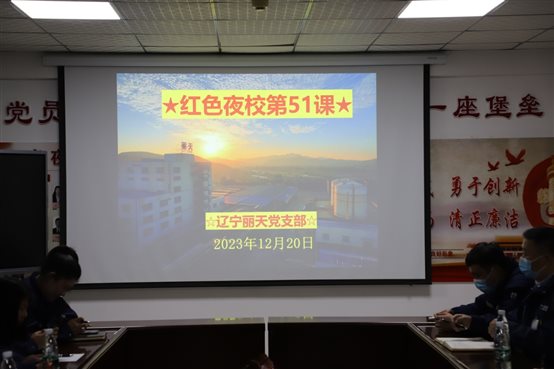 •    12月20日,辽宁丽天党支部开展“红色夜校”第51课,党员、入党积极分子、总经理室成员、各部门中层及部分群众参加此次学习。会议由支部书记陆敏山同志主持,本次会议共五项议程。           一、陆书记领学“第一议题”内容。  ...
