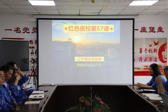 •     6月末,辽宁丽天党支部开展“红色夜校”第57课,总经理室成员、各部门中层、党员、入党积极分子及部分群众参加此次学习。会议由支部书记陆敏山同志主持,本次会议共四项议程。      一、落实“第一议题”内容。  陆书记传达习...