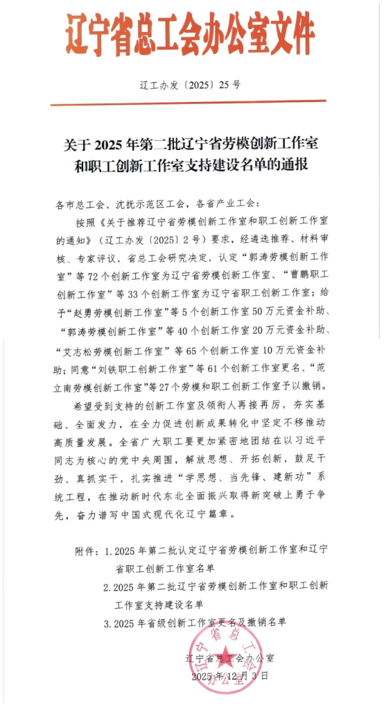 根据《辽宁省劳模创新工作室和职工创新工作室命名管理办法(修订)》(辽工发〔2024〕32号),2025年2月,苏豪丽天(辽宁)高分子材料有限公司满鑫劳模创新工作室积极参与评选,经高新园区审核,省工会评审,满鑫工作室荣获“...
