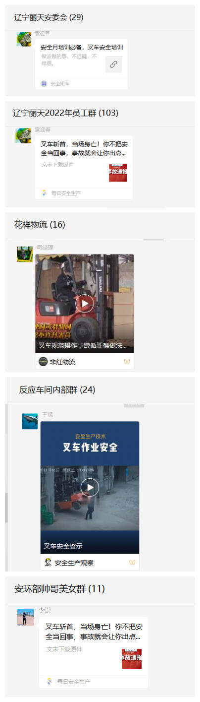 7月份以来,辽宁丽天依托安委会群、员工群、部门群、班组群层层递进发布叉车作业警示教育的宣传推文,切实以线上“宣传链”串起员工队伍“安全链”,确保叉车作业专项安全培训起好步。