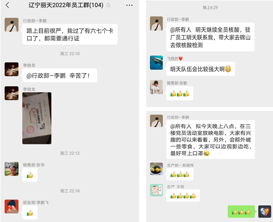 在疫情防控阻击战中,坚守岗位、临时驻厂的每一名员工都给以顾全大局、克服困难的兵工精神践行了使命担当,值得所有人为此点赞!在非常时期采取非常措施,非常符合习总书记提出的“疫情要防住,经济要稳住,发展要安全”的精神,这次疫情,既是对辽宁丽天团队战斗力的检验,也是对每一位员工在公司困难时期的一次考验。征程万里风正劲,重任千钧再奋蹄!相信公司在大家的共同努力下,一定会战胜困难,取得更好的发展。