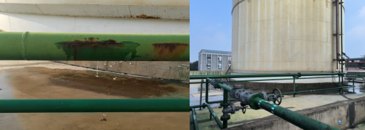 苯乙烯罐区喷淋水循环管道年久失修,整条管道内部锈蚀比较严重,已经出现多处漏水,本月完成管道换新工作。